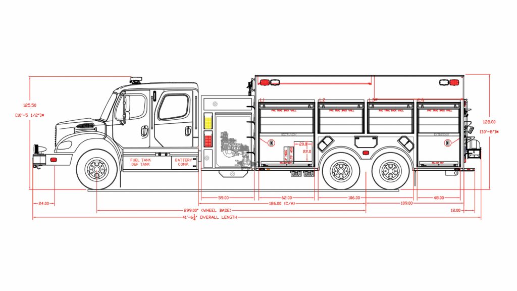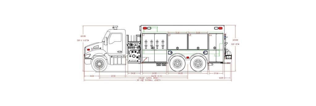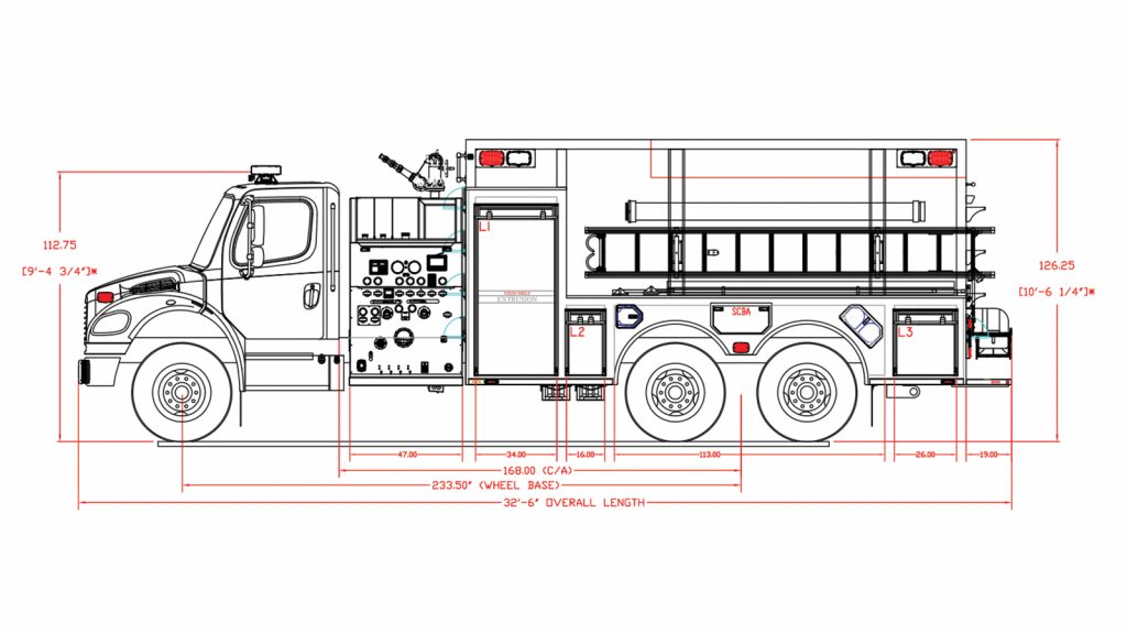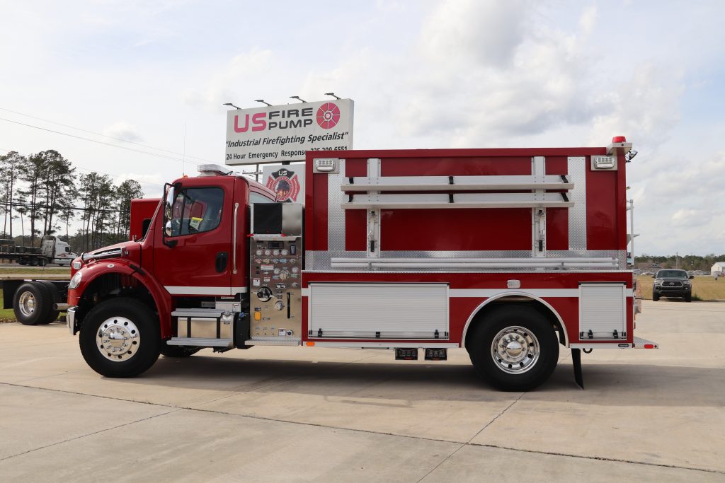 Freightliner M2-106 Commercial Chassis, Cummins L9 360 HP Engine, Hale QMax 1500 GPM Pump, 3000 Gallon L-Shaped Water Tank, 3/16″ Heavy Duty Extruded Aluminum Body