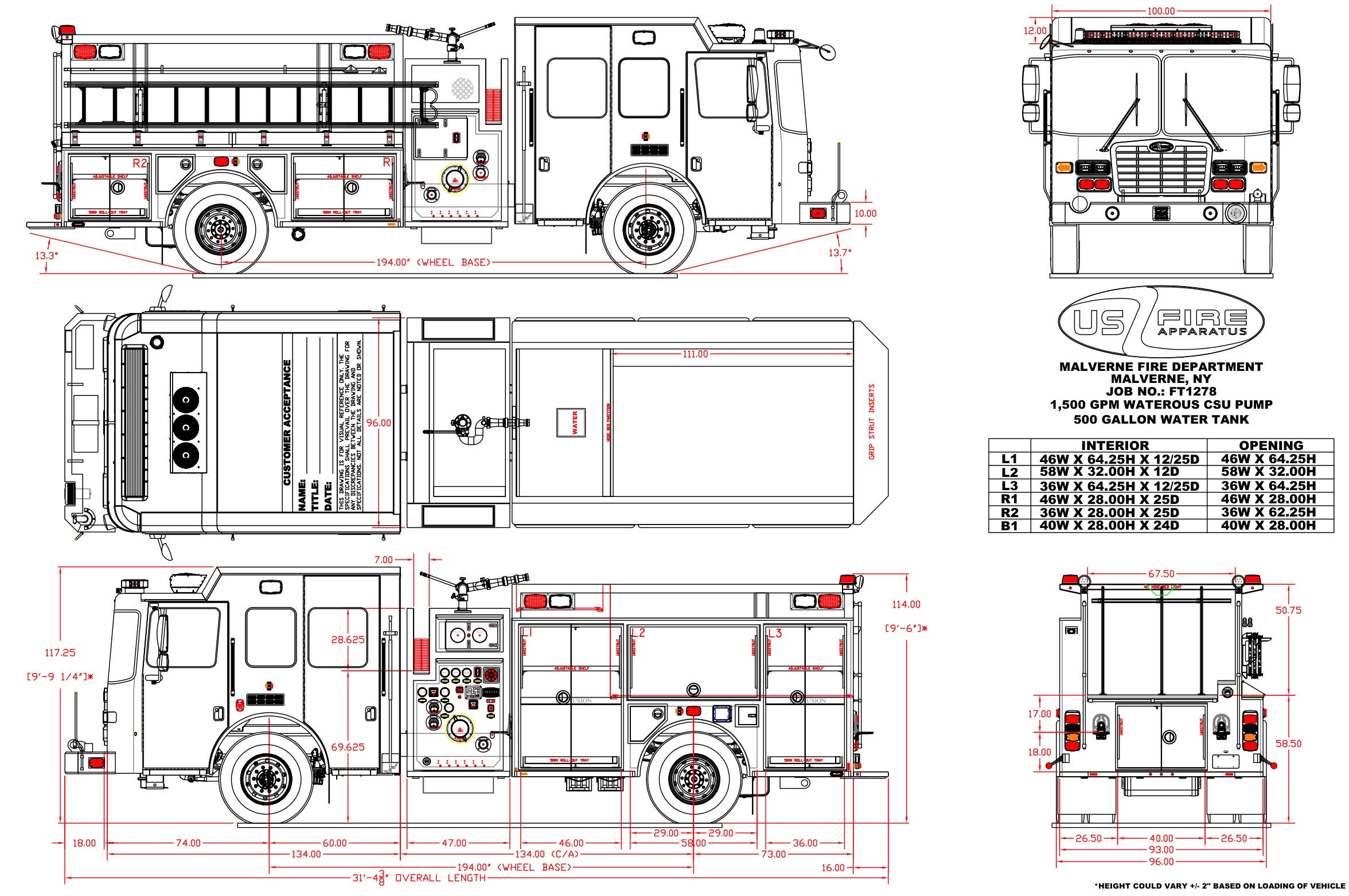 • US Fire Apparatus Custom Chassis• Cummins L9 450 HP Engine• Allison 3000 EVS Automatic Transmission• 50 Gallon Aluminum Fuel Tank• Waterous CSU 1,500 GPM Pump• 500 Gallon Water Tank• 3/16” Heavy Duty, Extruded Aluminum Body