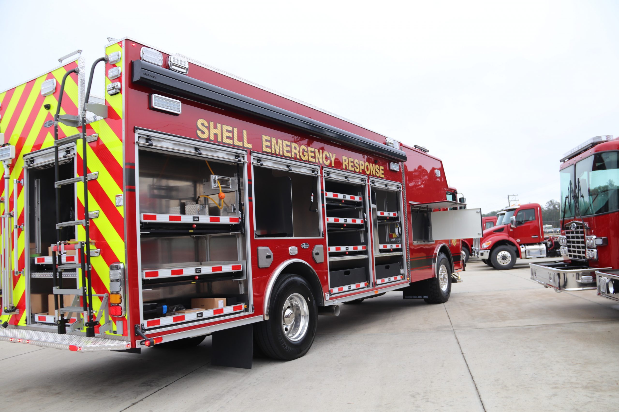- USFA heavy-duty 3/16″ marine-grade aluminum walk-around rescue fire body with upper coffin compartments